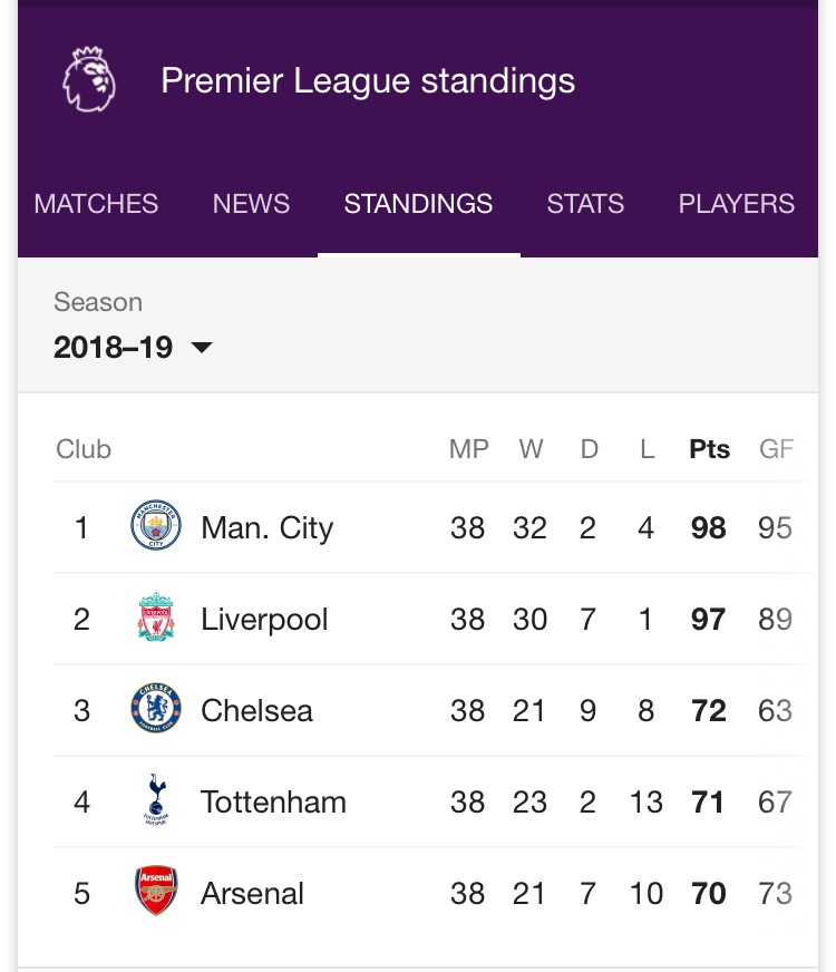 ဒုတိယေနရာက လီဗာပူးလ္နဲ႔ တတိယေနရာက ခ်ဲလ္ဆီးဟာ ၂၇မွတ္ထိ ကြားျခားခ်က္ရွိခဲ့တာကလည္း မန္စီးတီးနဲ႔ လီဗာပူးလ္ အသင္း၂သင္းတည္း ခ်န္ပီယံဆုအတြက္ၿပိဳင္ဆိုင္ေနေၾကာင္းေပၚလြင္ေနပါတယ္။
